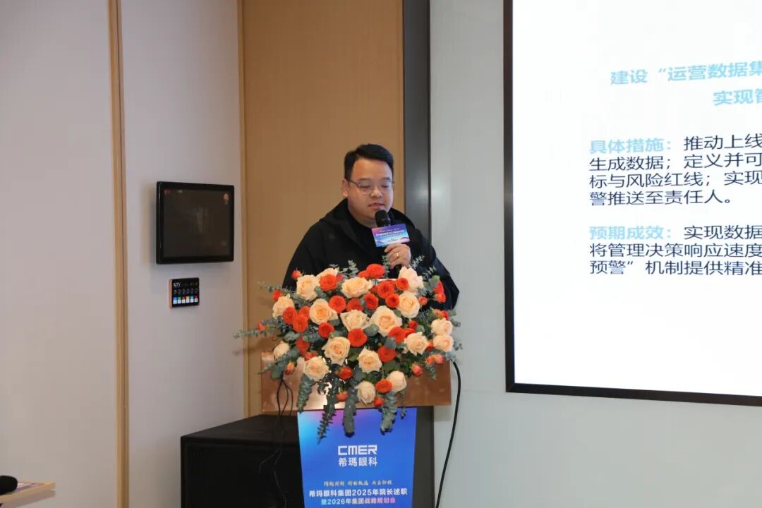 会议的核心环节之一是各医院2025年度院长述职暨2026年医院战略规划汇报。深圳希玛院长詹行楷、北京希玛CEO陈扬、昆明眼科CEO张敏、深圳新安希玛执行院长单城峰、珠海希玛CEO刘魏、上海希玛执行院长曹修鹏、广州希玛执行院长苏国文、惠州希玛执行院长莫浩敏、揭阳希玛执行院长罗晓春,依次上台报告2025年经营成果、存在问题及2026年发展目标。内容涵盖财务表现、团队建设、服务质量、市场策略、医疗质量管理及未来发展规划,体现区域差异化竞争策略与集团整体战略协同。