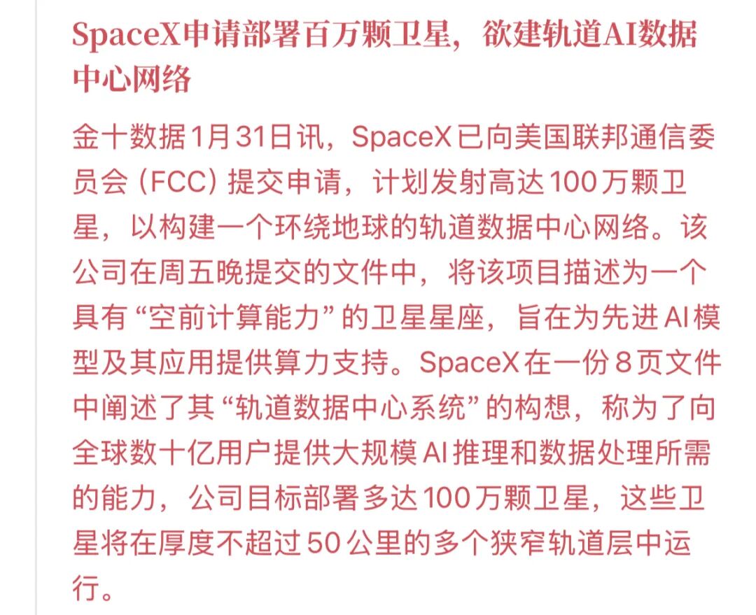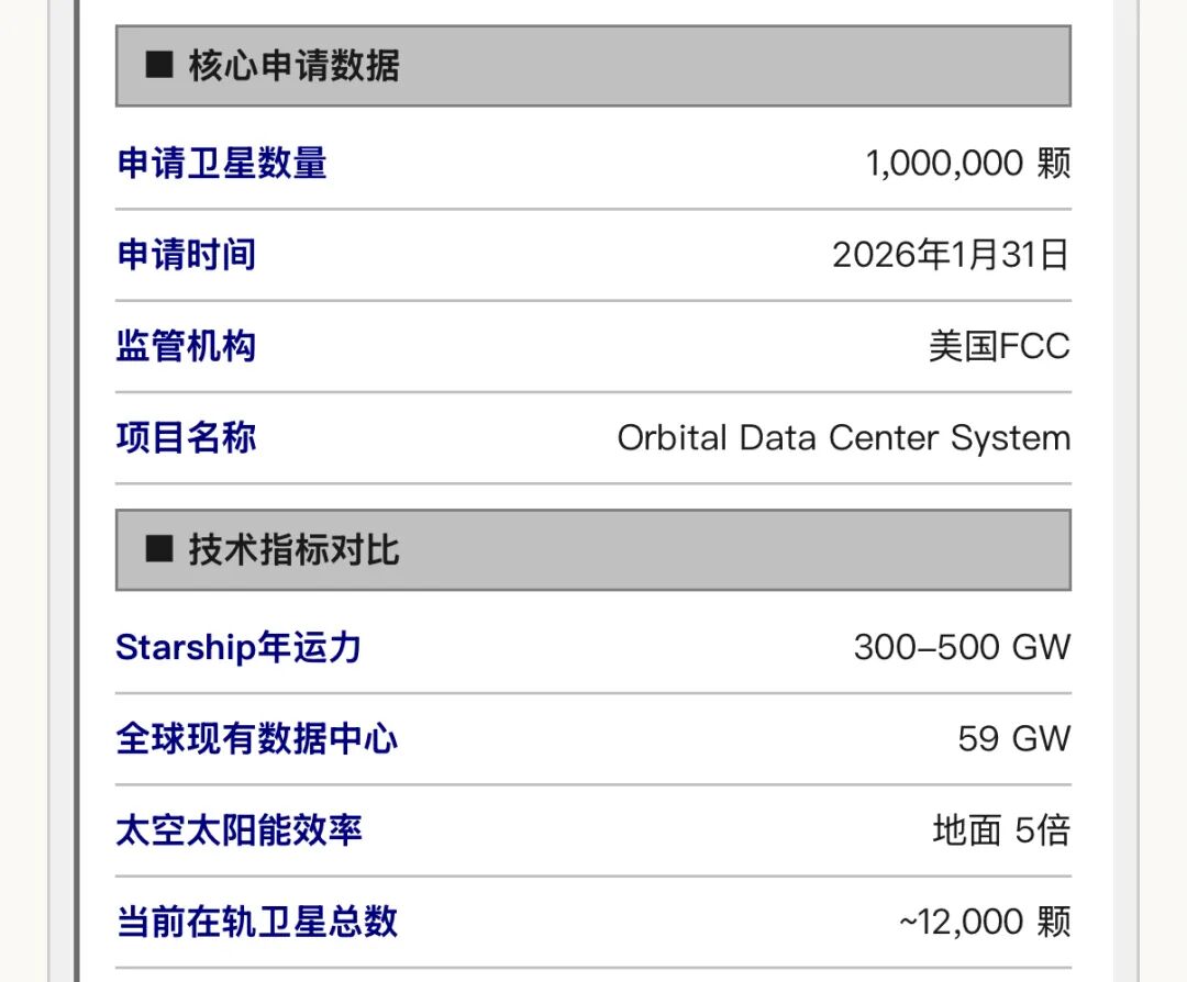 就在数日前,Reuters独家披露SpaceX正在与xAI探讨合并事宜——如果交易达成,马斯克旗下的Grok将直接获得轨道算力的加持。Bloomberg报道称,SpaceX同时还在评估与Tesla的潜在整合,Tesla的储能系统可为太空数据中心的太阳能利用提供技术支撑。