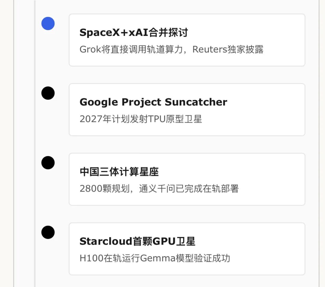 Google于2025年11月公布Project Suncatcher计划,拟2027年发射搭载TPU芯片的原型卫星;NVIDIA投资的Starcloud已于去年底成功发射搭载H100 GPU的卫星,并完成Gemma模型的在轨运行验证;中国国星宇航的"三体计算星座"规划2800颗卫星,且已在轨部署通义千问大模型,实现端到端推理。
