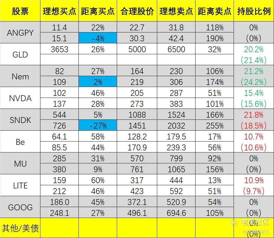 NVDA 15.4%,SNDK 21.8%,NEM 21.2%,GLD 20.2%,BE 10.7%,LITE 10.9% 现金/美债 0%。