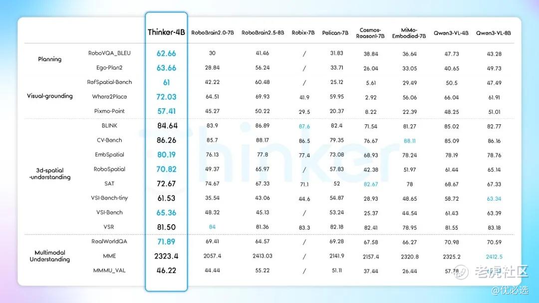 优必选具身智能大模型Thinker以“小参数、高性能、全开源”突破具身大脑领域限制。近日,在涵盖10B以下具身智能大脑模型的权威基准评测中,Thinker一举拿下9项第一,重新定义了该领域的性能标杆。这些基准全面评估了具身智能的两大核心能力:一是机器人第一视角下的场景认知与任务规划能力,二是支撑物理交互的精准感知与空间理解能力。