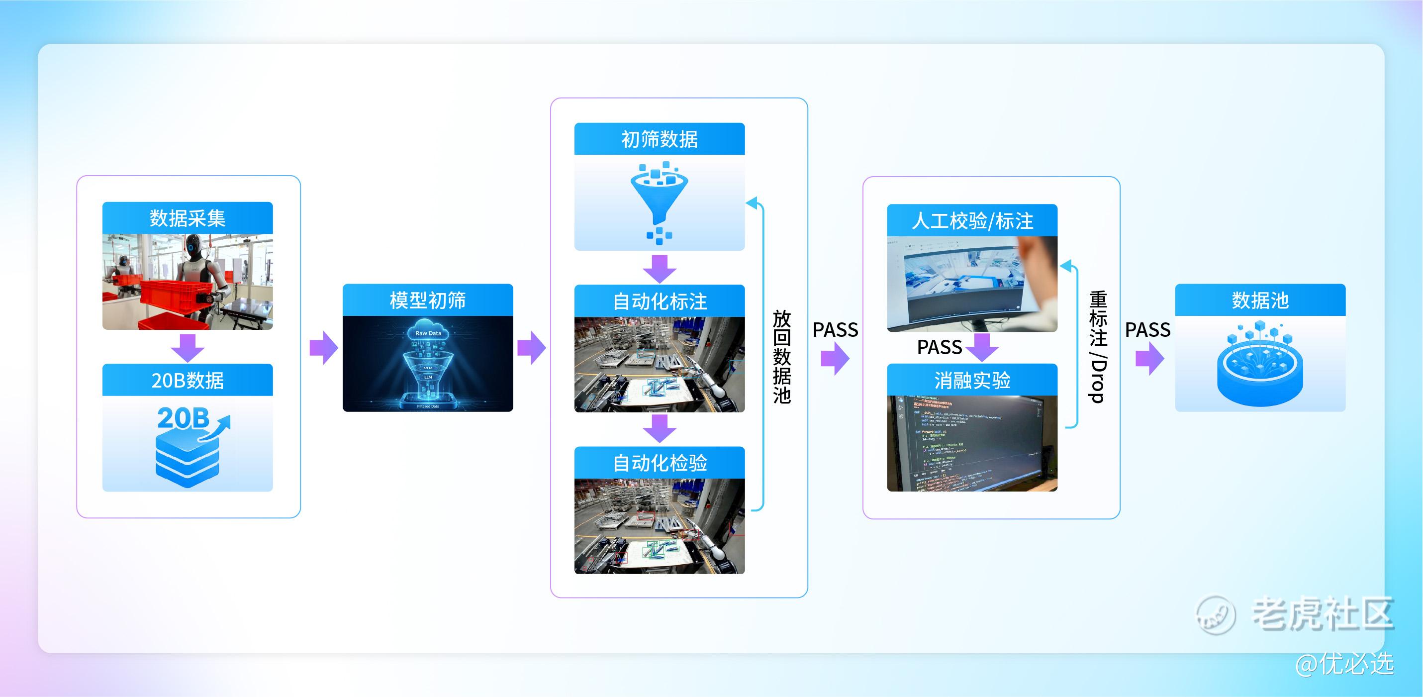 面对高达20B、含噪声、难对齐、模态缺失的原始数据,优必选构建了全流程自动化“精炼提纯”流水线。通过“数据筛选”与“质量评分”两步,实现从20B到10M级别高质量数据的极致提纯。