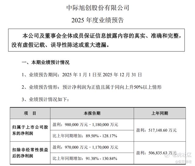 1月30日晚,中际旭创 $中际旭创(300308)$ 发布了2025年度业绩预告,预告显示,2025年预计公司实现净利润98亿元至118亿元,同比增长89.50%至128.17%,去年同期净利润为51.71亿元;实现扣非净利润97亿元至117亿元之间,同比增长91.38% 至130.84%,去年同期为50.68亿元。