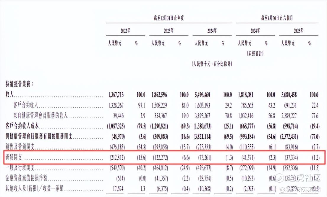 毕读财经检索发现,微医在招股书提到了776次“AI”,但实际AI含金量存疑。从研发来看,微医控股研发开支逐年缩减。2022-2024年分别为2.13亿元、1.22亿元、7326万元,2025年上半年仅3733万元,占营收的比重从2022年的15.6%降低至2025年上半年的1.2%。