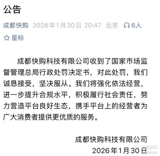 2026年1月30日,成都快购科技有限公司发布回应公告,明确表示“诚恳接受,坚决服从”该处罚决定。公司称将强化依法经营意识,进一步提升合规管理水平,积极履行社会责任,着力营造平台良好生态,携手平台经营者为消费者提供更优质的服务。