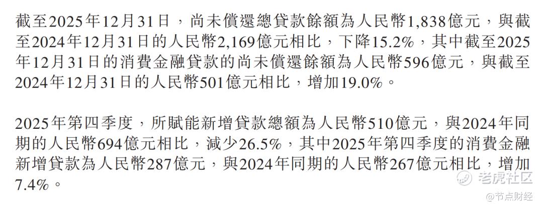 数据显示,截至2025年12月31日,公司累计借款人数2910万人,较上年同期增加12.5%;总贷款余额为1838亿元,较上年同期下降15.2%,其中,消费金融贷款余额为596亿元,同比增长19.0%。