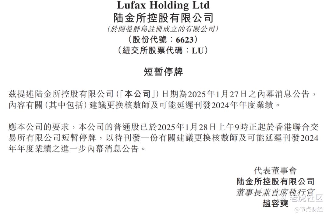 2025年1月27日港股收盘后,陆金所的多份公告震动资本市场:更换核数师(正式与普华永道解约);2024年业绩可能延迟发布;公司H股暂停买卖。