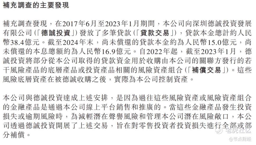 为什么这么做?陆控给出的理由是:因为公司线上平台曾面向零售投资者,进行过这类高风险资产或风险资产组合的销售与推广。当相关产品出现投资损失或逾期风险时,为减轻对公司声誉的影响,并控制风险敞口,便通过德诚投资开展了上述交易,旨在补偿受影响的零售投资者。