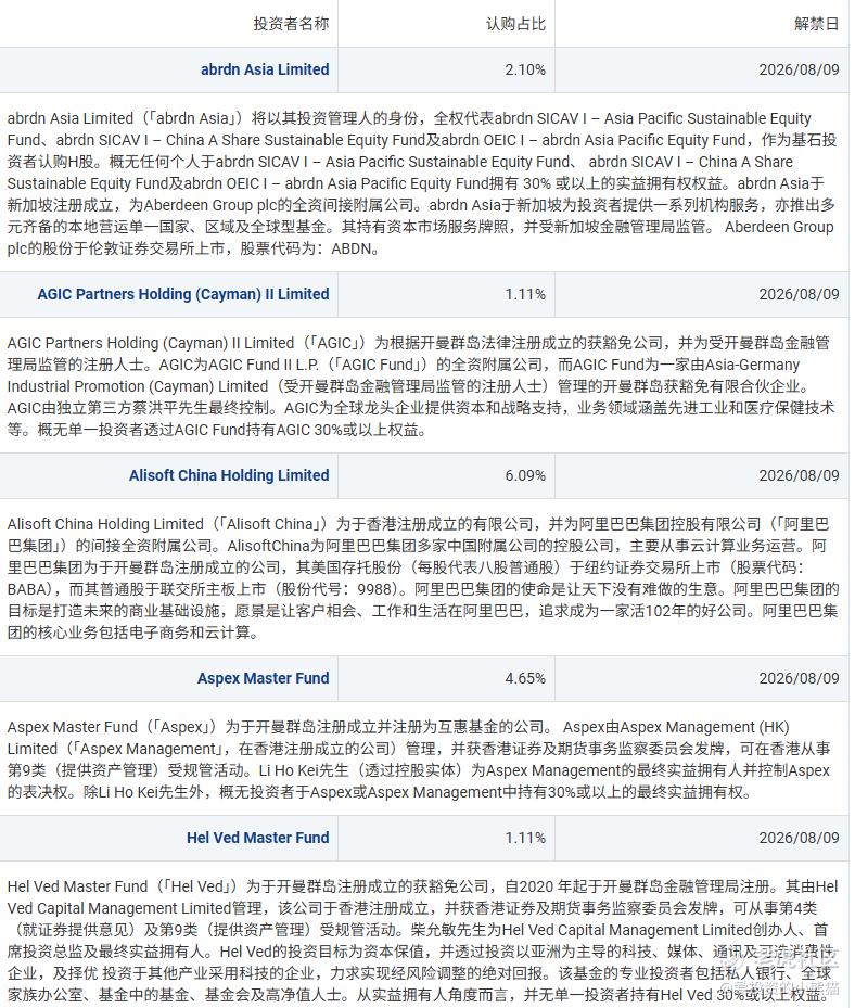 - abrdn Asia Limited:认购2.10%,其母公司安本是全球领先的资产管理公司,业务覆盖全球,在亚洲科技、金融等领域布局深入。