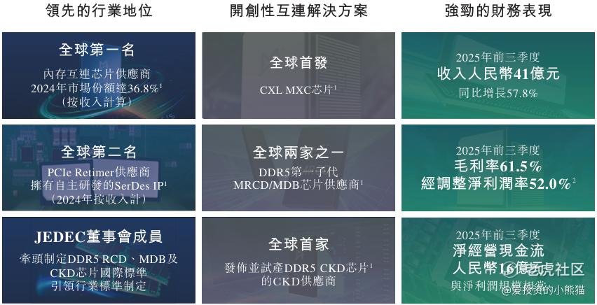 在行业地位上,公司2024年以36.8%的收入份额成为全球最大的内存互连芯片供应商,同时也是全球第二大PCIe Retimer供应商,并拥有自主研发的SerDes IP。作为JEDEC董事会成员,澜起科技牵头制定了DDR5 RCD、MDB及CKD芯片的国际标准,是全球首家试产DDR5 CKD芯片、首发CXL MXC芯片的厂商,也是全球仅有的两家DDR5第一子代MRCD/MDB芯片供应商之一。