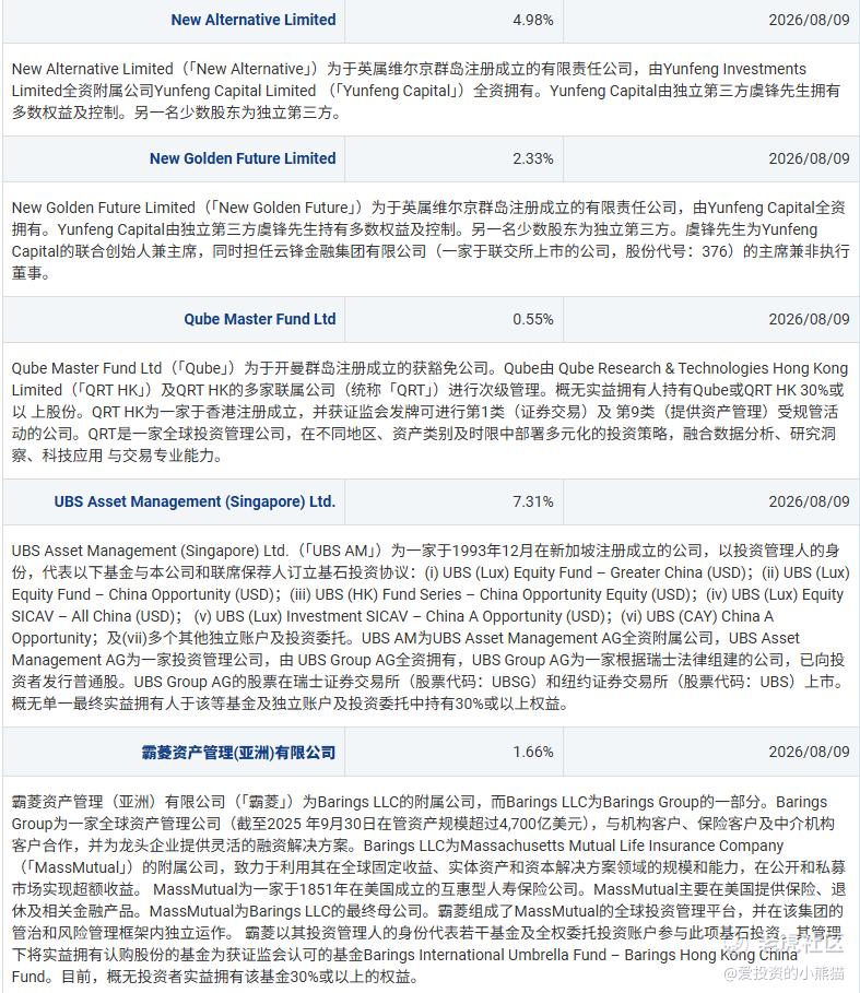- Aspex Master Fund、Janchor Partners Pan-Asian Master Fund:分别认购4.65%,Aspex是专注亚洲市场的对冲基金,擅长挖掘科技领域高成长企业价值;Janchor Partners(正心谷资本相关基金)聚焦亚洲科技、消费等赛道,长期陪伴优质企业发展。