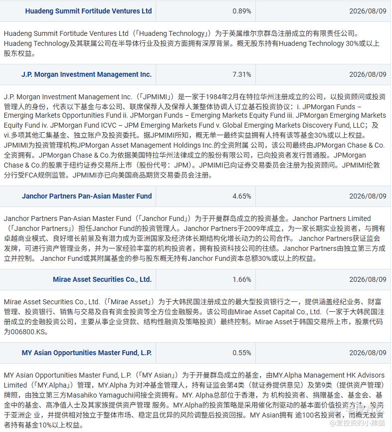 - Mirae Asset Securities Co., Ltd.:认购1.66%,是韩国最大金融集团未来资产旗下证券业务主体,在全球资本市场布局广泛,积极参与亚洲科技企业资本运作。