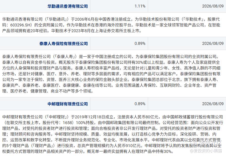 - 霸菱资产管理(亚洲)有限公司:认购1.66%,霸菱是历史悠久的全球资管机构,在亚洲市场深耕多年,专注多元资产投资,在科技、消费等领域有成熟布局。