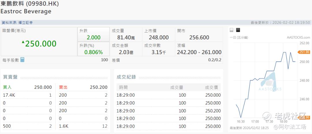 2月3日,市值千亿、有“A股功能饮料第一股”之称的 $东鹏饮料(09980)$ 在港交所挂牌交易上市,股价开盘反应平平。截至发稿前,最高股价仅249.8港元/股,最低则下探至245.6港元/股,较发行价248港元/股“平字当头”,总市值1387亿港元。