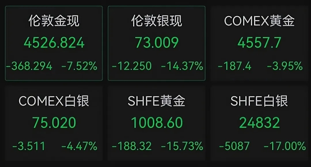 从接近5600美元到现在的4526美元,金价两个交易日就暴跌超过1000美元!反正我长这么大,也是第一次见到。