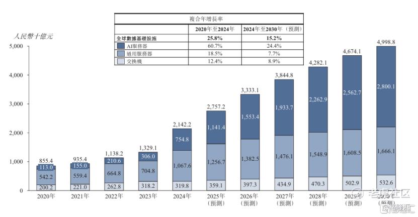 从更宏观的层面看,灼识咨询数据显示,全球数据基础设施市场规模已从2020年的8,554.3亿元增长至2024年的21,422.4亿元,预计到2030年将增至49,988.1亿元。其中,AI服务器在2024年的市场规模达到7,548.1亿元,占比已超过三成,成为最核心的增长驱动力。