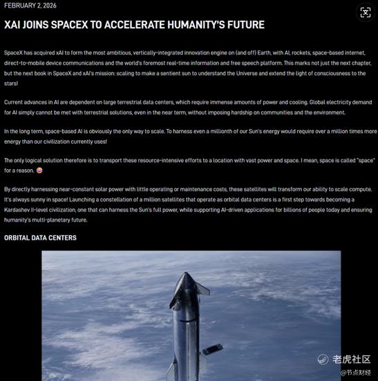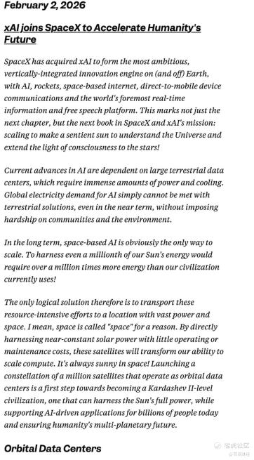 SpaceX与xAI的合并,从来不是简单的企业整合,而是马斯克实现其星辰大海野心的关键一步。这场合并背后,是他对人类科技未来的极致构想——打破AI与太空的边界,利用太空的无限能量,推动人类文明迈向更高层次,最终实现多行星生存的终极目标。
