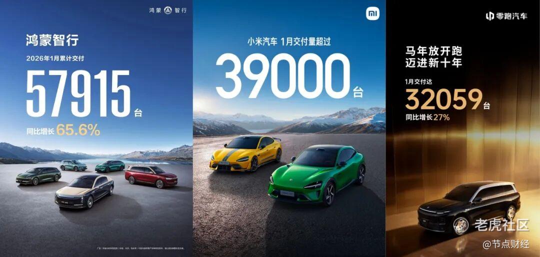 零跑汽车1月份交付32059辆,同比增长27%。作为2025年最高光的造车新势力,零跑汽车目前已布局 C10、C11、C16、B01、B10、Lafa5、T03 等车型,覆盖纯电与增程混动;2026年也将冲击 “年销百万辆” 目标。其旗舰MPV零跑D19将于今年4月上市,预计售价在25万至30万元之间。