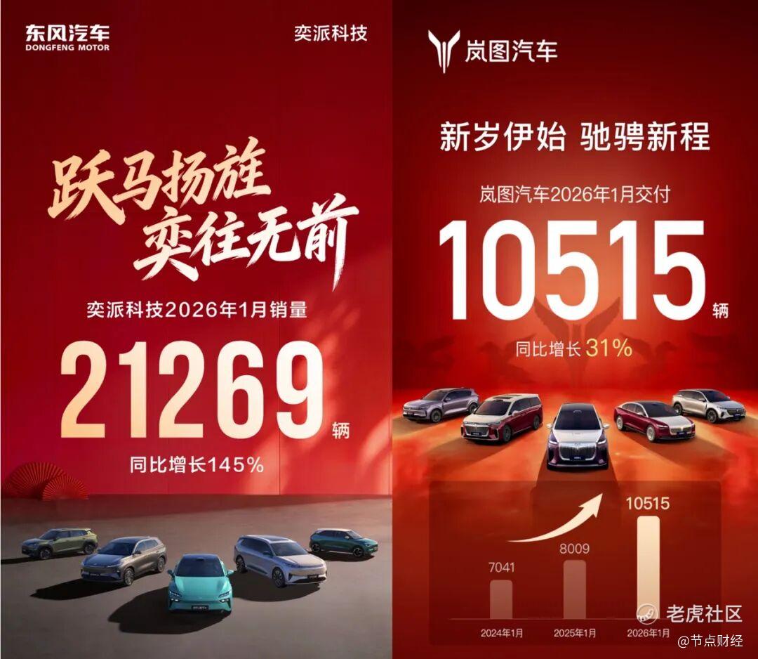 更令人惊喜的是东风汽车旗下的两大新能源品牌的表现。岚图汽车1月交付 10515辆,同比增长31%。东风奕派科技1 月销量21269辆,同比增长145%。