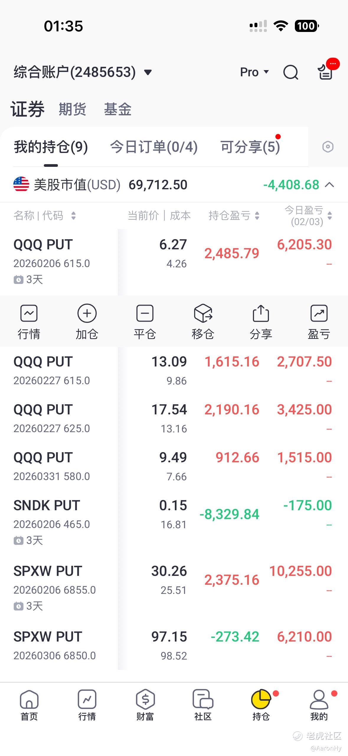 昨天挨打,今天回血,put拿的住还是认知! 那些说反向指标的 真的是喜欢拿一天说话。可惜的是昨天标普500的 6950put到期了,还是亏的 应该做一个延期继续开的!现在美股说真的也是人吃人了[无语] 一致看空的行情就是要先拉爆意志不坚定的空头 然后在下杀。我就说自己的认知行动路线是没问题的!