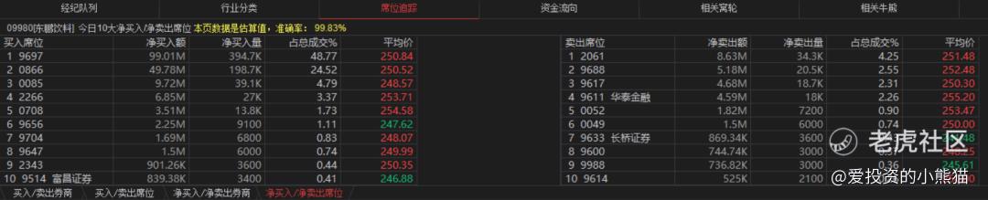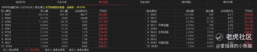 东鹏饮料(09980.HK)买盘席位有9697、0866、0085、2266等,卖盘第一席位是2061。