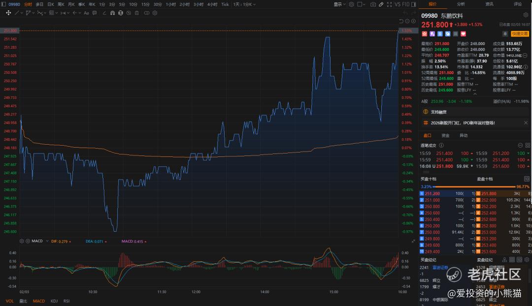 $东鹏饮料(09980)$ 2026年2月3日上市,以248.00港元平开,随后上冲回落破发,最低探到245.60港元,午后拉升,最终收于251.8港元,涨1.53%,成交13.77亿港元,全天价格运行重心显著上移,呈现强势上行特征。