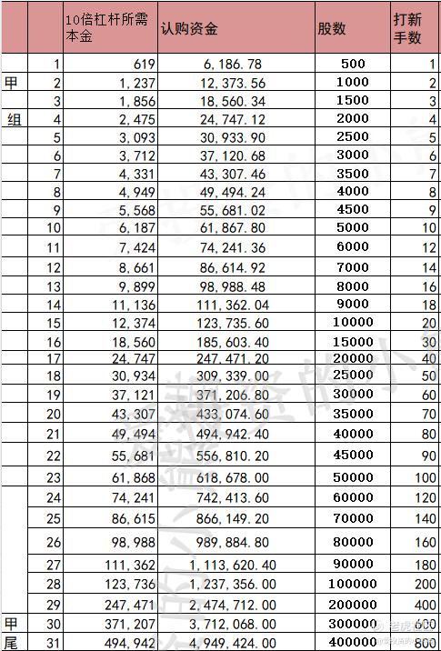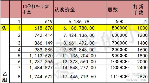 这个票甲尾495万,乙头需要认购资金619万,乙组的各档融资所需要的本金还有融资金额对应如下表: