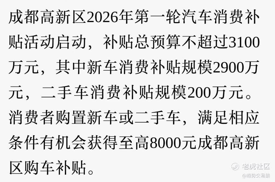 $优信(UXIN)$截至2026年2月3日,全国已有超20地推出以旧换新、购车补贴新政。而在此前一日,成都最新汽车消费补贴上线。据“成都发布”,成都高新区2026年第一轮汽车消费补贴活动启动,补贴总预算不超过3100万元,其中,新车消费补贴规模2900万元,二手车消费补贴规模200万元。消费者购置新车或二手车,满足相应条件有机会获得至高8000元成都高新区购车补贴,其中,购买二手车最高申请4000元购车补贴。