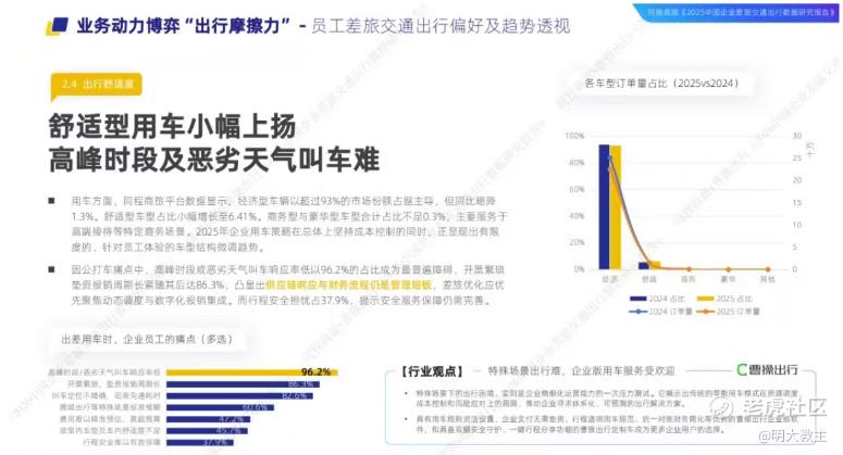 不过汽车出行正成为差旅出行的新难点。同程商旅发布的《2026中国企业差旅交通出行数据研究报告》显示,在早/晚高峰、恶劣天气中,企业用户叫车响应率较低;员工需事先垫付车费且报销周期较长;多数TMC平台存在定位不准确、沟通耗时也长。这无疑为曹操出行等网约车平台提供了切入商旅赛道的良机。
