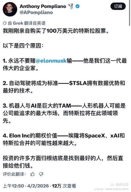 💥🚀 加密领域的重量级人物 Anthony Pompliano,刚刚公开买入 100 万美元的 $TSLA。