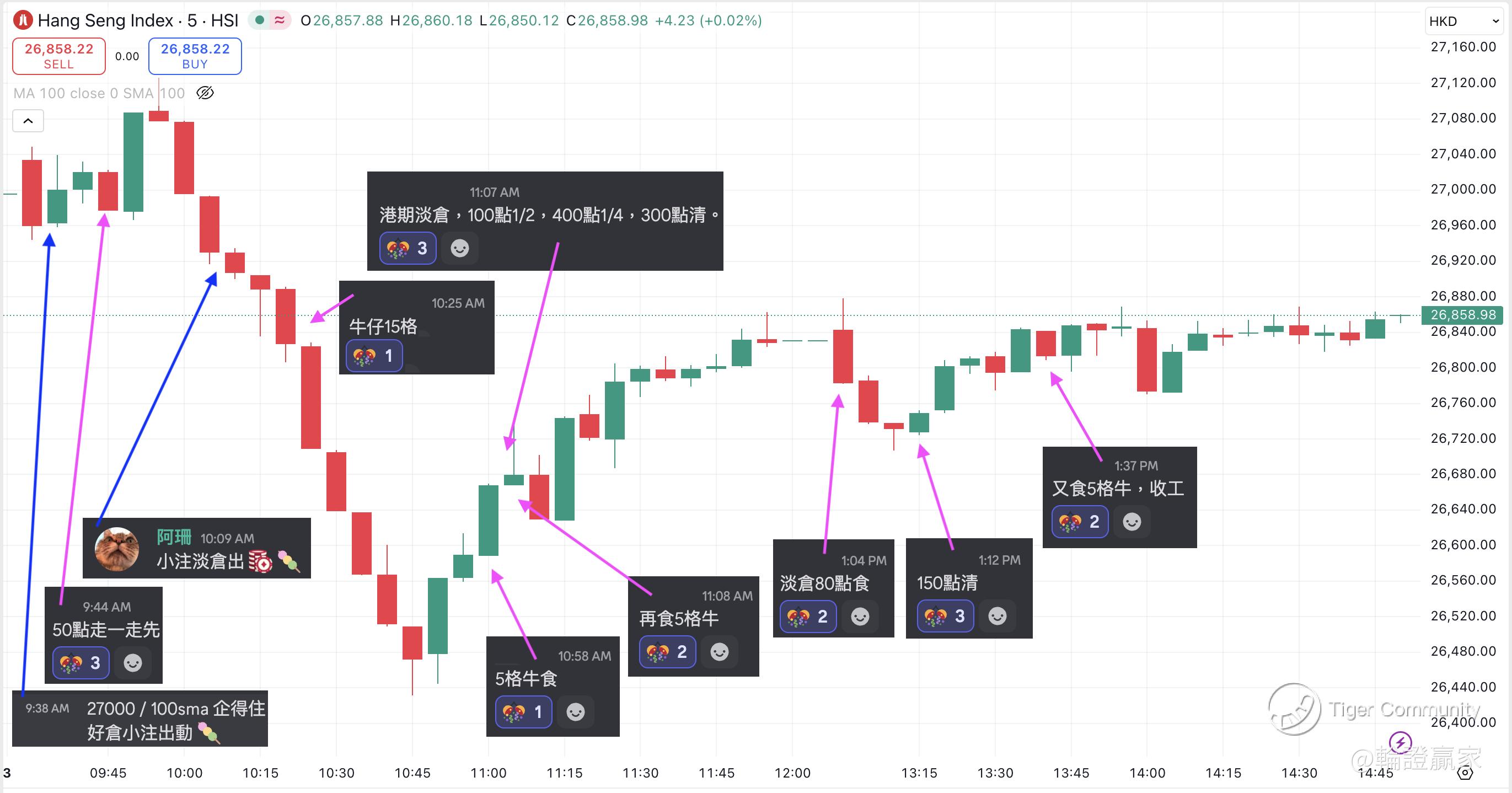 㖊日下半场要外出所以无睇到个市,但今朝返嚟同作战室嘅战友一齐睇,见到原来五分钟图用咗3点至4点呢段时间行咗个「楔形」出嚟。而今朝指数开市后初段都仲系喺个「楔形」里面运行至10点前见指数向上突破「楔形」顶线,作战室有战友先收150点好仓先。