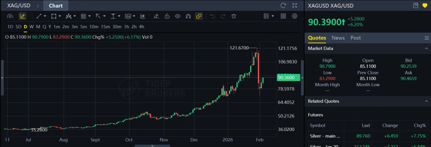 白银在上周高位阶段一度升破121美元,随后录得有记录以来最大单日跌幅(26.9%),跌至79美元,跌势明显重于黄金。今日银价再次站上90美元关口,修复比例超13%。