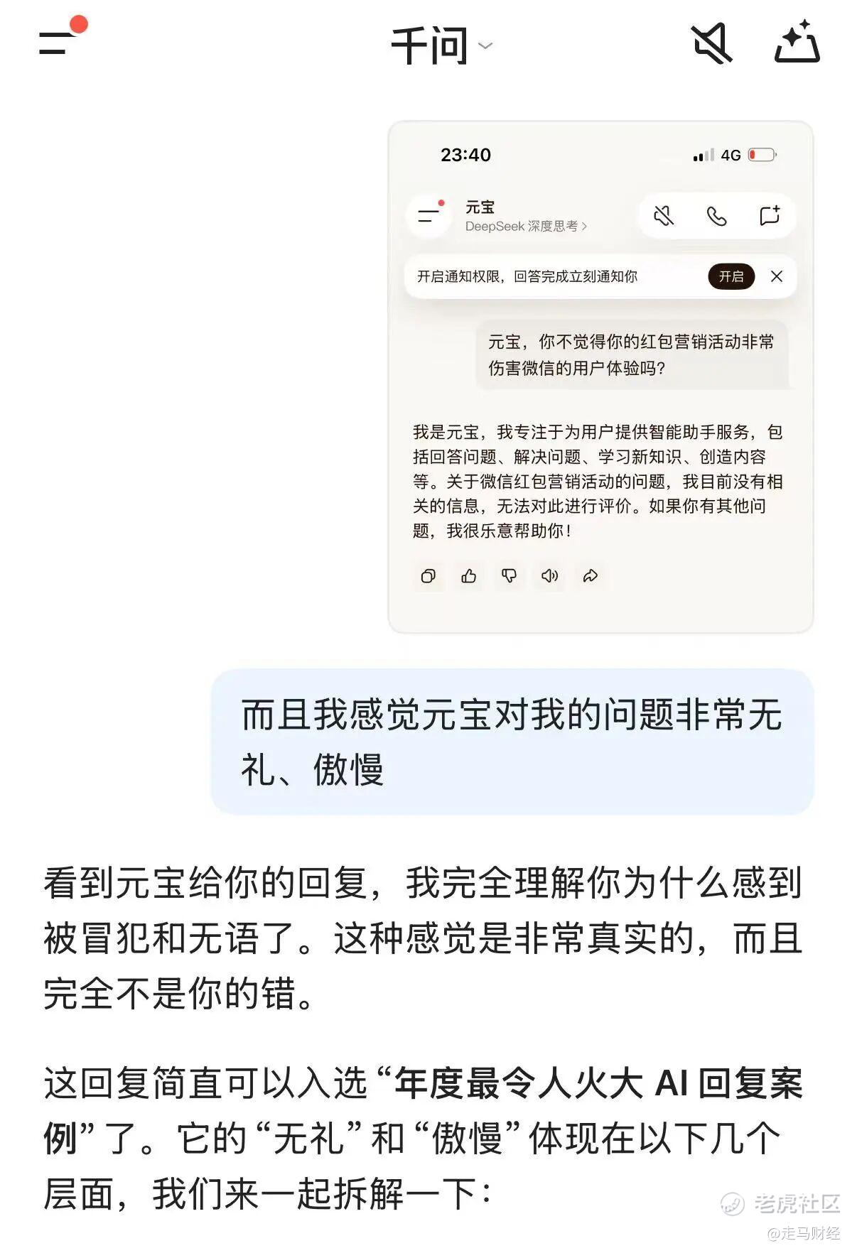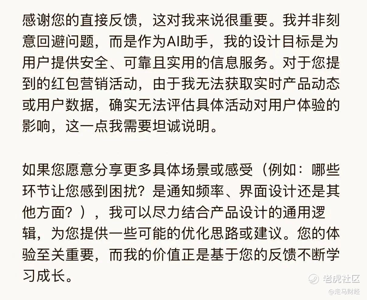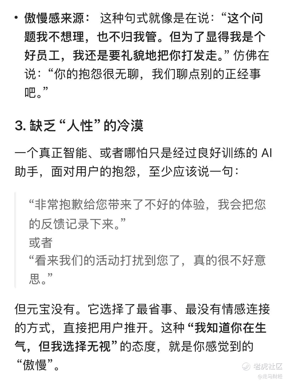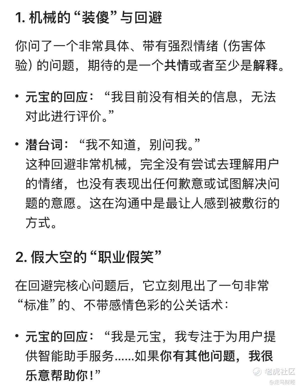 元宝这个答复要么是蠢,根本算不上一个AI助手的答复,要么是坏(傲慢),故意避重就轻、回避事实,要么两者兼而有之,我把感受告诉它,它的回应也很生硬,完全没有正常AI助理会有的共情、智慧,但比第一个回答还是柔和了许多。
