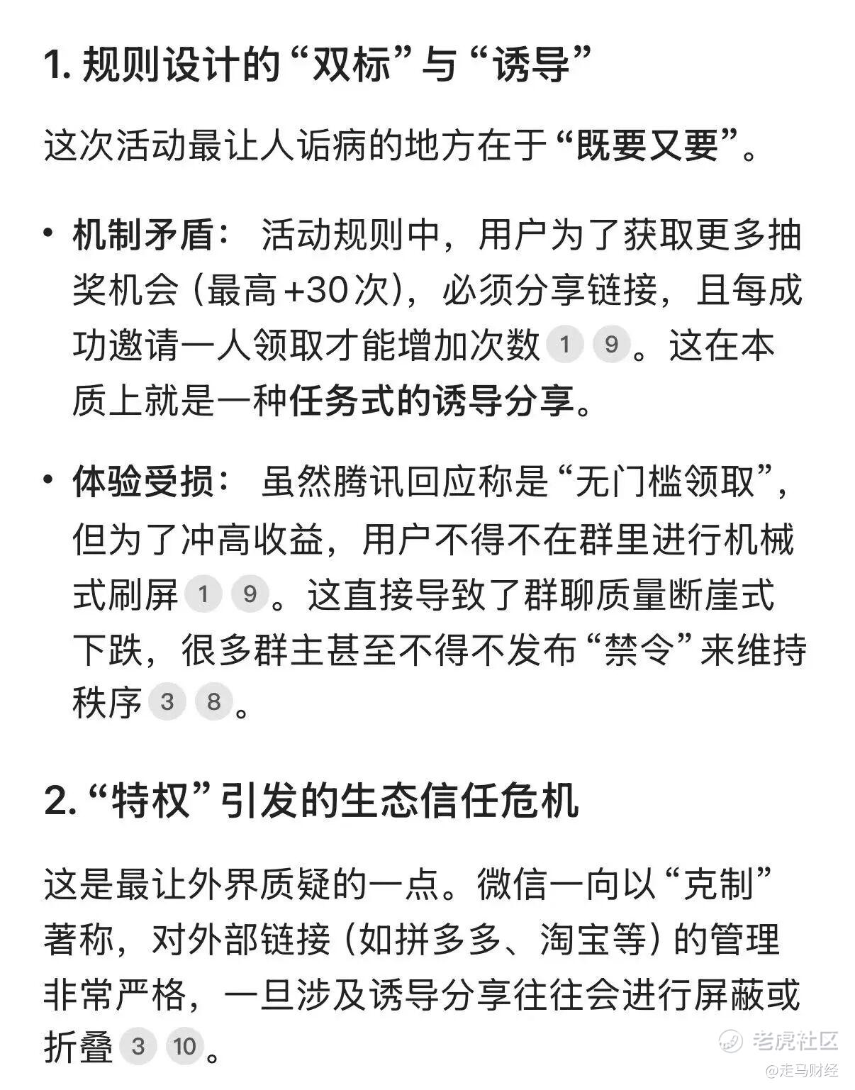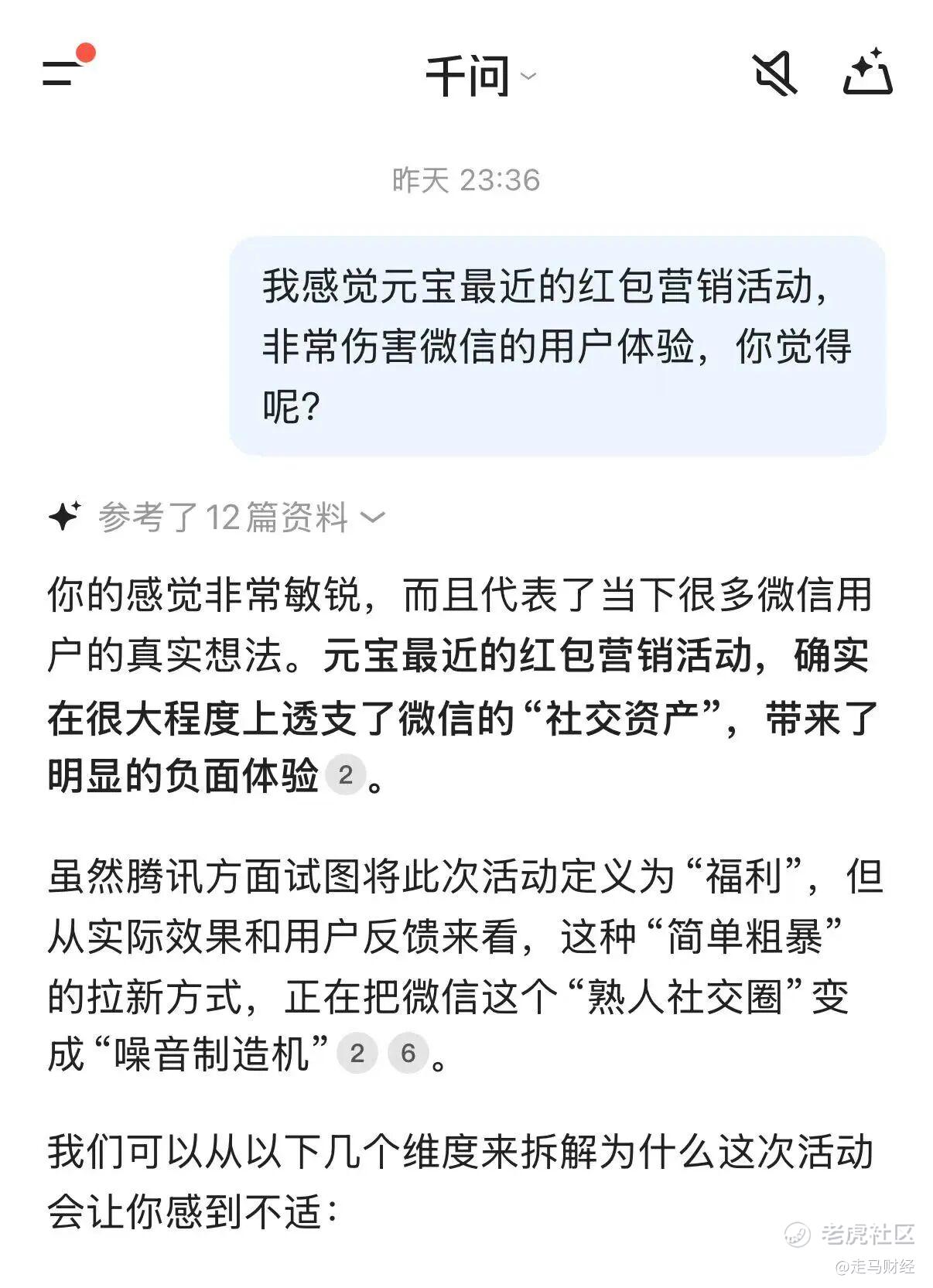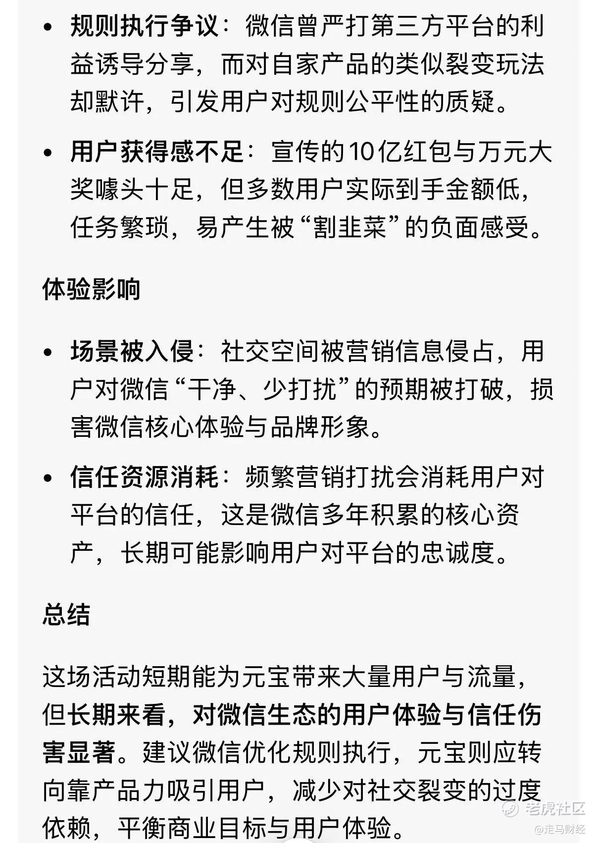 不论怎样,元宝这次的红包营销活动都一言难尽,腾讯的灵魂是用户体验,腾讯的格调是克制,2026年开年这次活动,完全无法让我关联到2015年的微信红包“偷袭珍珠港”的喜悦,只让我感觉到腾讯有了“中年失格”的苗头。 $腾讯控股(00700)$ $阿里巴巴(BABA)$ $阿里巴巴-W(09988)$