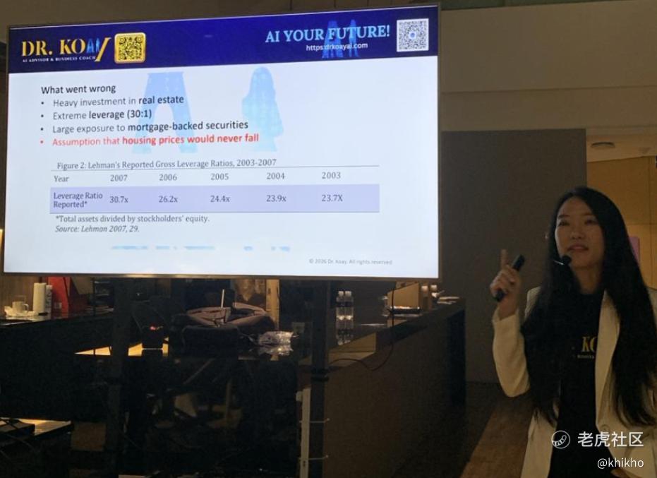 她以2008年金融危机的经典案例开篇,以通俗易懂的方式,就这么一种普通的叙事方式立即抓住了我的注意力。Dr. Koay展示了Shiller Real Home Price Index的历史走势图,清晰地呈现出2006年美国房价见顶回落的轨迹,以及随后引发的连锁反应。借款人违约、抵押支持证券价值崩塌,最终导致雷曼兄弟这家拥有6190亿美元资产的金融巨头轰然倒塌。