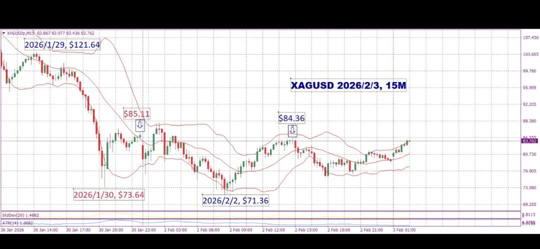 →走势与黄金同频,也走到了1小时图的布林带上轨线,现在$85.24,突破了W形象中轴$84.36。