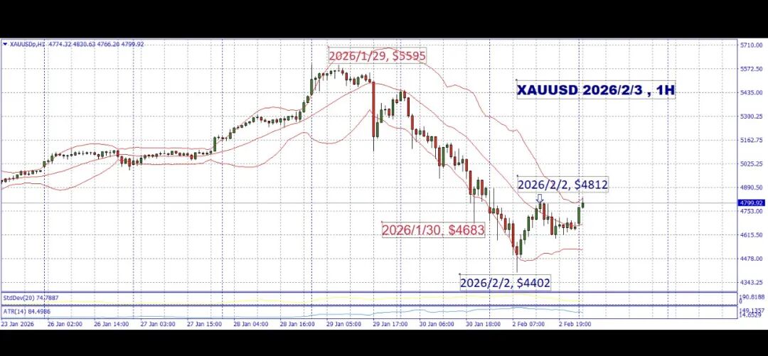 →黄金昨天从$4402止跌反弹至$4812。(从布林带下轨线反弹至布林带上轨线)。