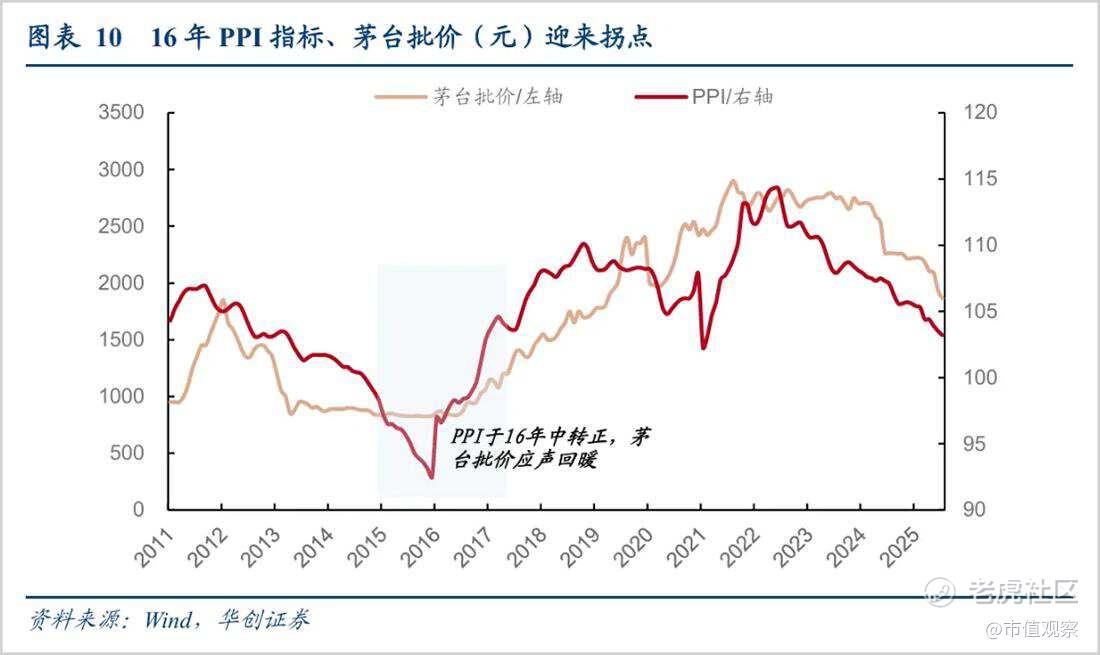 据华创证券研究,以茅台批价和PPI走势进行对比,2016年春节后白酒在二季度批价有所回落,行业仍存在“反弹还是反转”的分歧,但随着年中PPI增速转正,茅台批价从2016年下半年起震荡走高并于年底站上千元,随后头部酒企利润表开始好转,正式标志着新一轮周期开启。