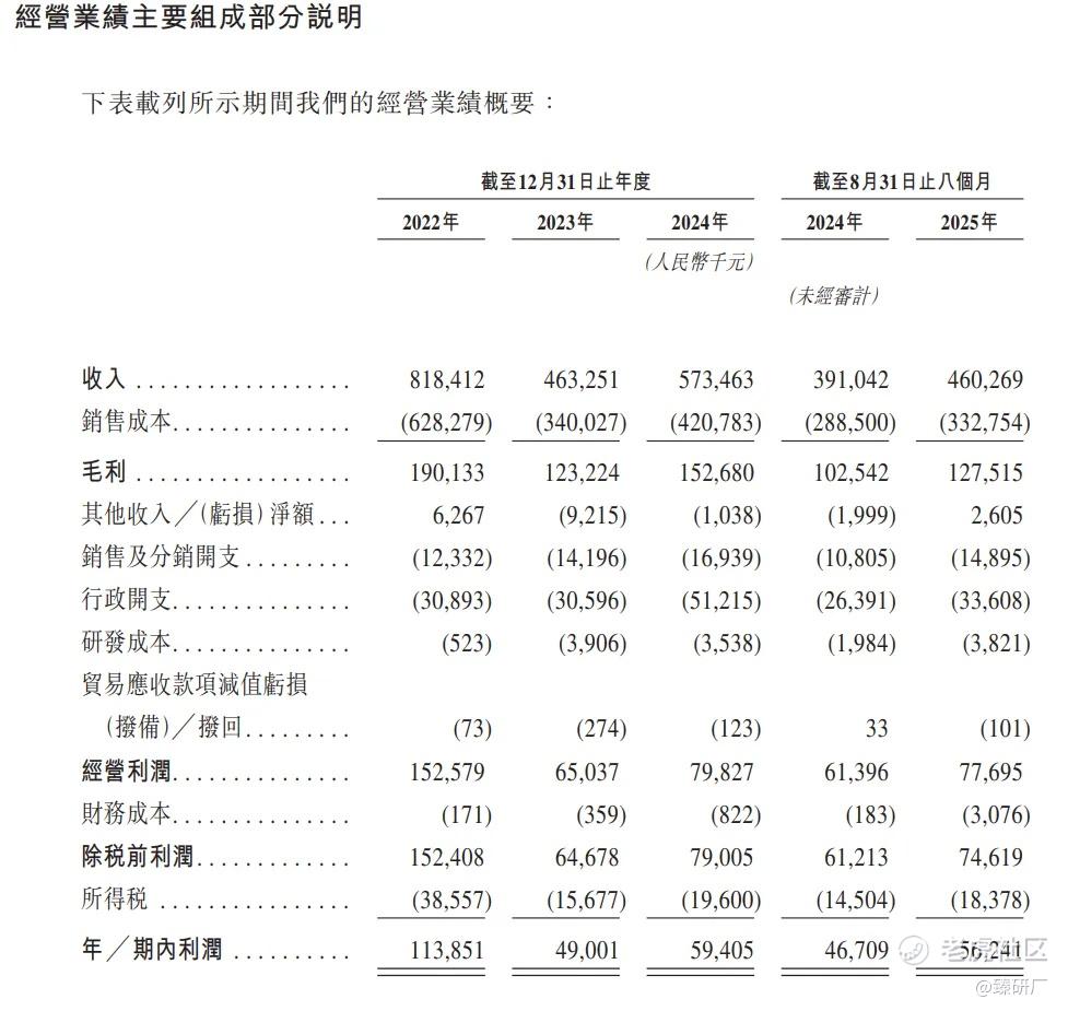 公司毛利与毛利率方面,2022至2023年,毛利由1.90亿元减少至1.23亿元,但毛利率由23.2%提升至26.6%,主要得益于美元兑人民币汇率上行利好海外销售、内部生产自动化与效率提升、铁管等主要原材料价格下跌,以及产品售价上调;2023至2024年,毛利增长23.9%至1.53亿元,毛利率稳定维持在26.6%;截至2028年8月31日,毛利增加至1.28亿元,同期毛利率上升至27.7%。净利润方面,年内利润由2022年的1.14亿元减少57.0%至2023年的0.49亿元,净利率也随之降至10.6%,2024年年内利润达0.59亿元,净利率达10.4%,截至2025年8月,公司期内利润达0.56亿元,同比增长20.4%,同期净利率达12.2%。
