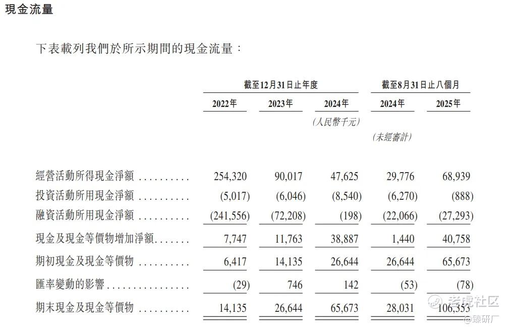 公司经营活动现金流净额2022年达2.54亿元,主要得益于高除税前利润及存货、应收款减少与应付款增加的支撑;2023年降至0.90亿元,2024年进一步降至0.48亿元,主要受应收款和存货占用资金增加影响;截至2025年8月31日反弹至0.69亿元,源于除税前利润增长、存货减少及折旧等非现金项目调整。融资活动现金流方面,2022-2023年因大额视作分派导致流出较高(分别为2.42、0.72亿元);2024年因新增借款和重组款项流入,流出仅20万元;截至2025年8月31日因偿还关联方及银行贷款,流出达0.27亿元,部分被新银行贷款流入抵销。期末现金及现金等价物方面,2022年达0.14亿元增长至2024年的0.66亿元,截至2025年8月,期末现金达1.06亿元,整体来看公司现金流处于逐步改善状态。