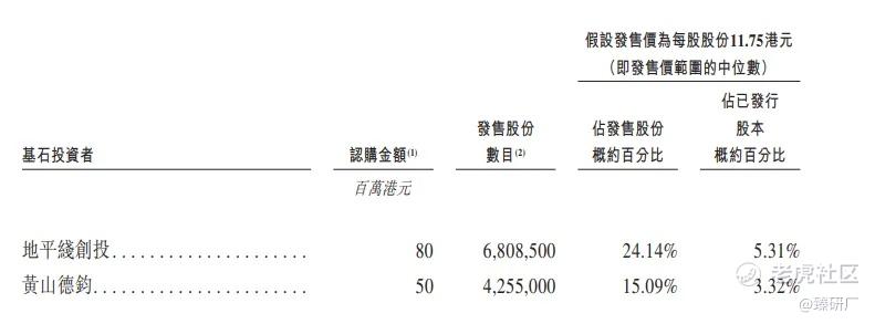 本次发行拥有2名基石投资者,分别为地平线创投及黄山德钧合计认购0.50亿港元,按发售价每股11.75港元,基石投资者认购的发售股份总数为11,063,500股,约占根据全球发售发行的发售股份的39.23%(假设超额配股权未获行使)。