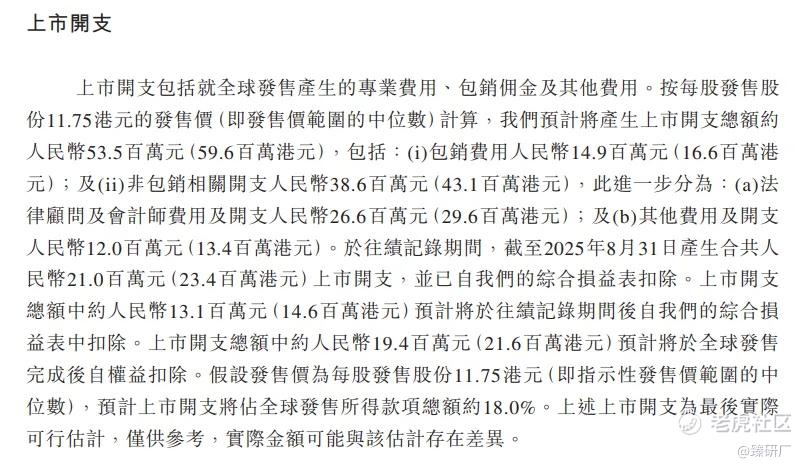按发售价中值11.75港元计算(假设未获行使超额配股权),公司上市总支出预计约为0.54亿元人民币,约占全球发售所得款项总额约18.00%。约0.13亿元预计将于往绩记录期间后从我们的综合损益表中扣除,上市开支中约0.19亿元预计将于全球发售完成后自权益扣除。