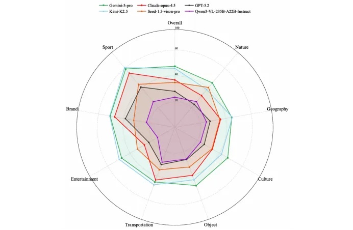 从雷达图中可以看到,大部分模型很擅长体育运动和品牌标识等网络数据充足的领域。综合得分第一和第二的Gemini-3-Pro和Kimi-K2.5表现尤为突出。