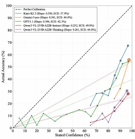 可以看到,所有模型在声称自己有95%以上的信心时,实际准确率连70%都不到,纯属“一本正经地胡说八道”。其中Kimi-K2.5在高信心水平下能达到接近70%的准确率,自我认知相对最准确。