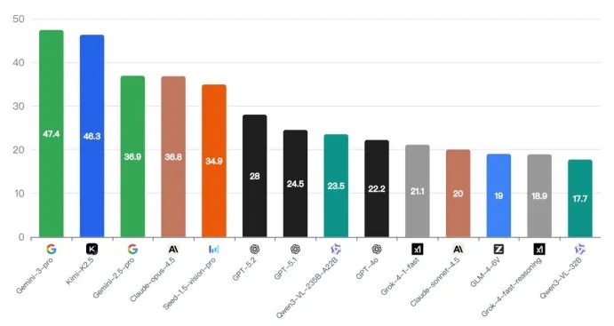 Gemini-3-Pro作为公认的全球顶级AI模型、Kimi-K2.5凭借“主场优势”,虽然位列前二,但只能分别取得47.4%和46.3%的正确率;专攻多模态领域的字节跳动和Anthropic旗下的产品准确率则未能达到40%。