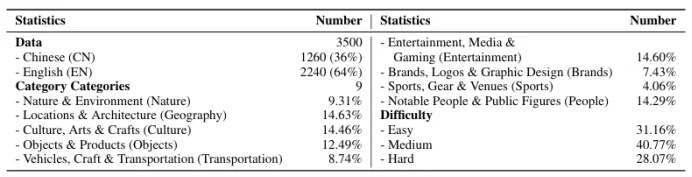 评测集在构建时采用基于模型性能的难度分层机制:研究团队将五个前沿多模态模型集成,并用它对所有候选图像样本进行评估。