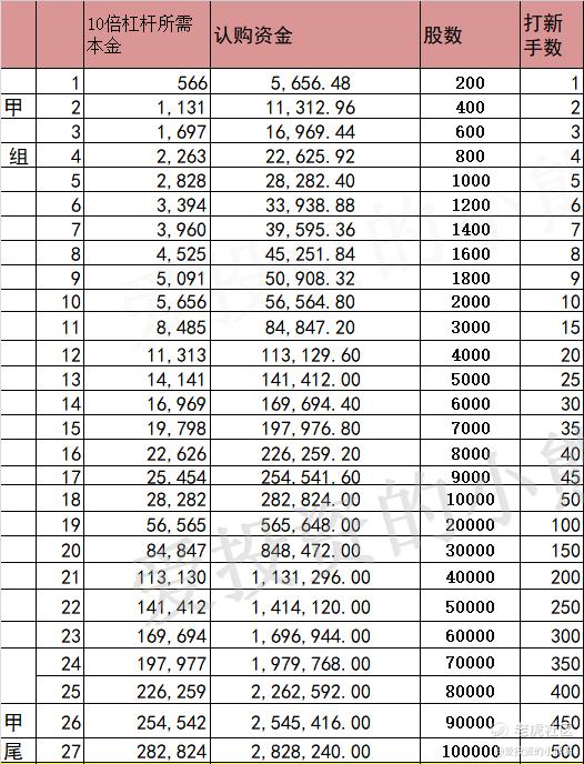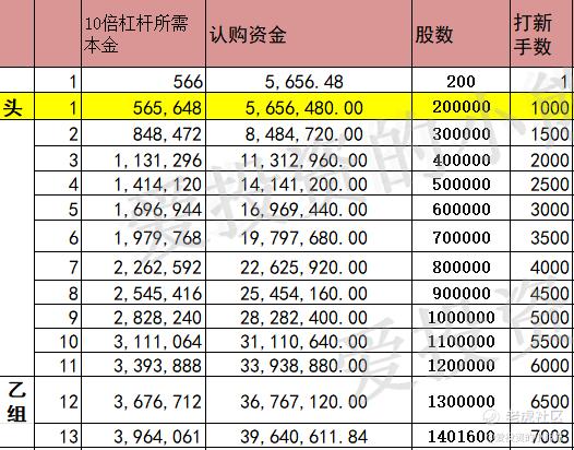 这个票甲尾283万,乙头需要认购资金566万,乙组的各档融资所需要的本金还有融资金额对应如下表: