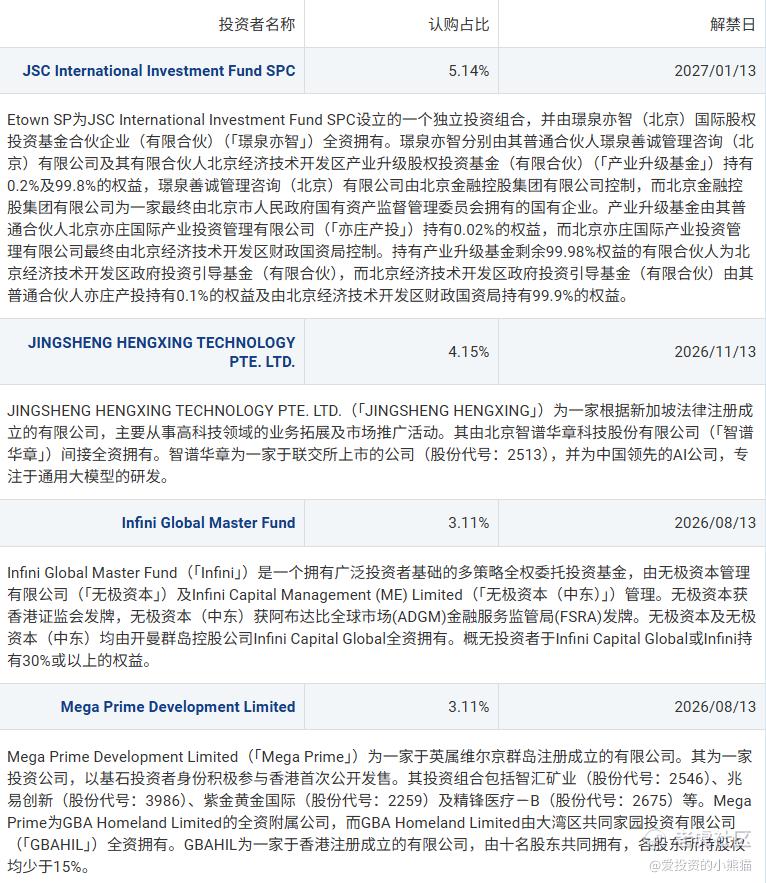 海致科技集团在IPO阶段引入的基石投资者阵容,涵盖国资背景投资平台、头部AI企业关联主体、全球顶级主权投资基金及大湾区核心国资投资平台,合计认购占比达15.51%,且各基石投资者均明确了解禁日期,彰显了资本市场对公司图模融合技术与产业级AI解决方案的高度认可。以下为各基石投资者的详细背景与股权架构解析: