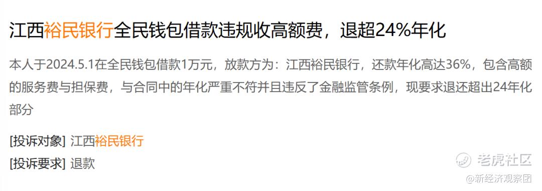 有用户表示,其在全民钱包借款1万元,资方为裕民银行,年利率高达36%。而全民钱包自身被投诉量超过15000个。