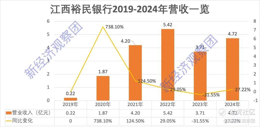 从营收上看,2019-2024年,裕民银行营收分别为0.22亿元、1.87亿元、4.2亿元、5.42亿元、3.71亿元和4.72亿元,2020-2024年增速分别为738.1%、124.5%、29%、-31.55%和27.22%,其中开业早年的2020年和2021年表现亮眼,随后2022年增速大幅缩水,2023年一度陷入负增长,2024年才恢复增长。但在新的监管环境下,裕民银行的营收增长能否持续还有待观察。
